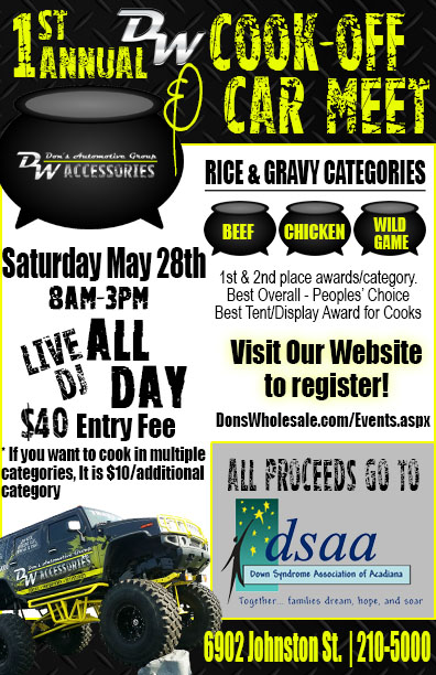 Don's Wholesale Automotive Group is hosting their 1st Annual Cook-Off and Car Meet with all proceeds go to DSAA. There is a $40 entry fee for Rice and Gravy cook-off.
