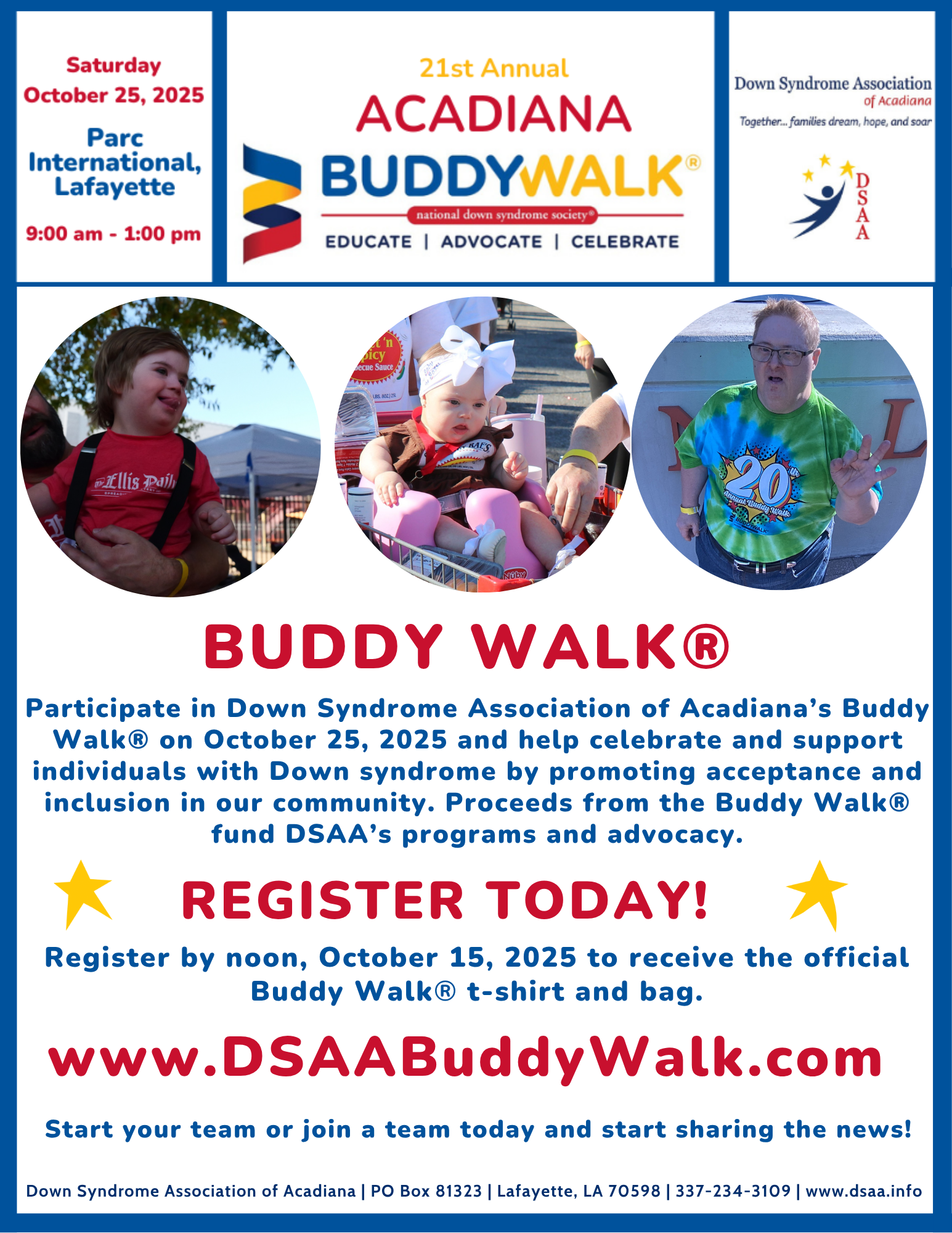 Down Syndrome Association of Acadiana (DSAA) hosts an annual Buddy Walk®, Acadiana’s only event celebrating all individuals with Down syndrome. Join us as we unite for a common cause and raise funds at the 2025 DSAA Acadiana Buddy Walk®. We attract over 1,000 participants and volunteers who walk the 1-mile course. Immediately following the walk there will be food, activities and live music entertainment for the whole family. Whether you have Down syndrome, know someone who does, or just want to show your support, take the first step and donate or register today! Help us spread the word. All are welcome for our day of celebration! Join us for the 21st Annual Buddy Walk® and help us assist families with Down syndrome.